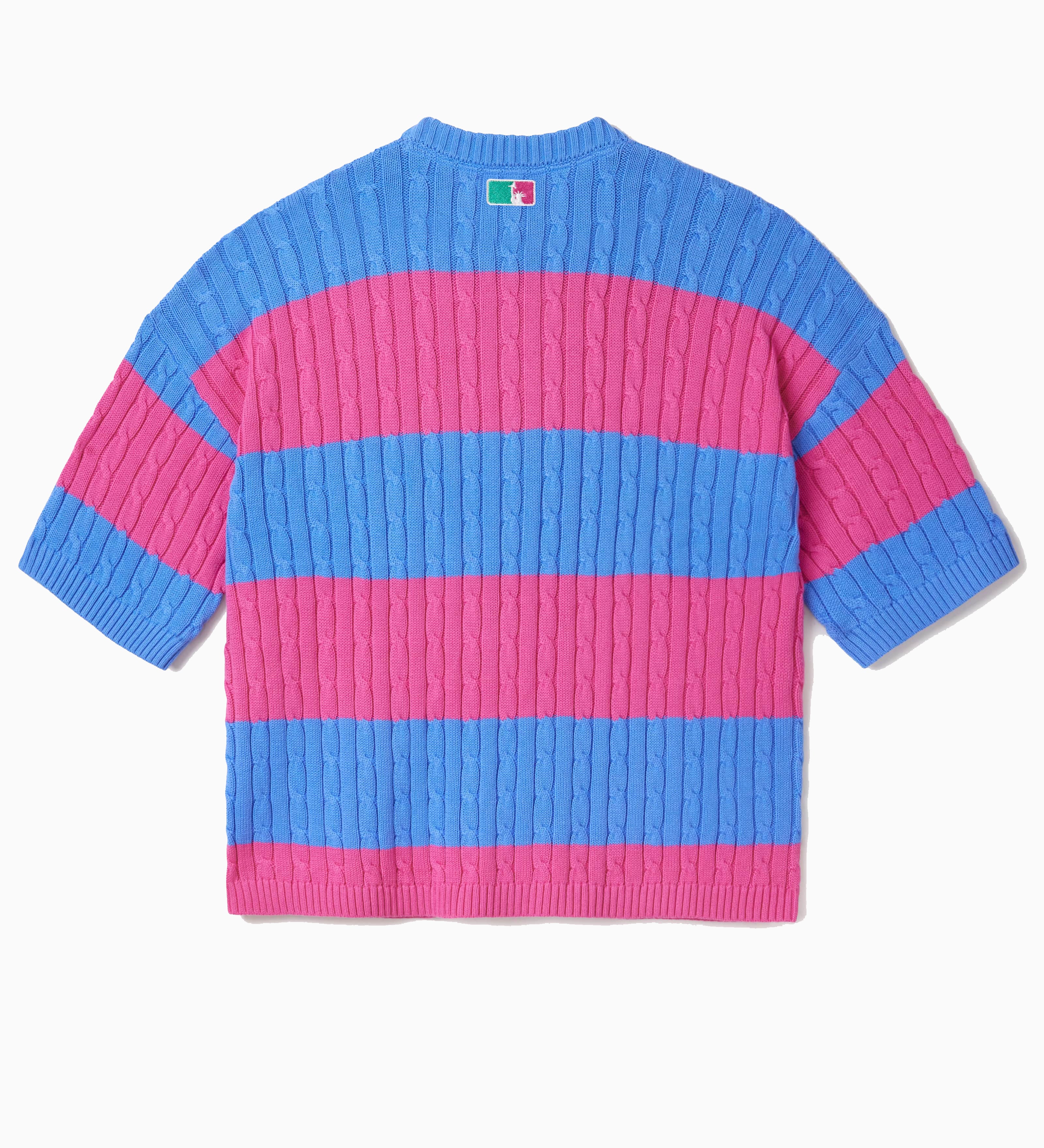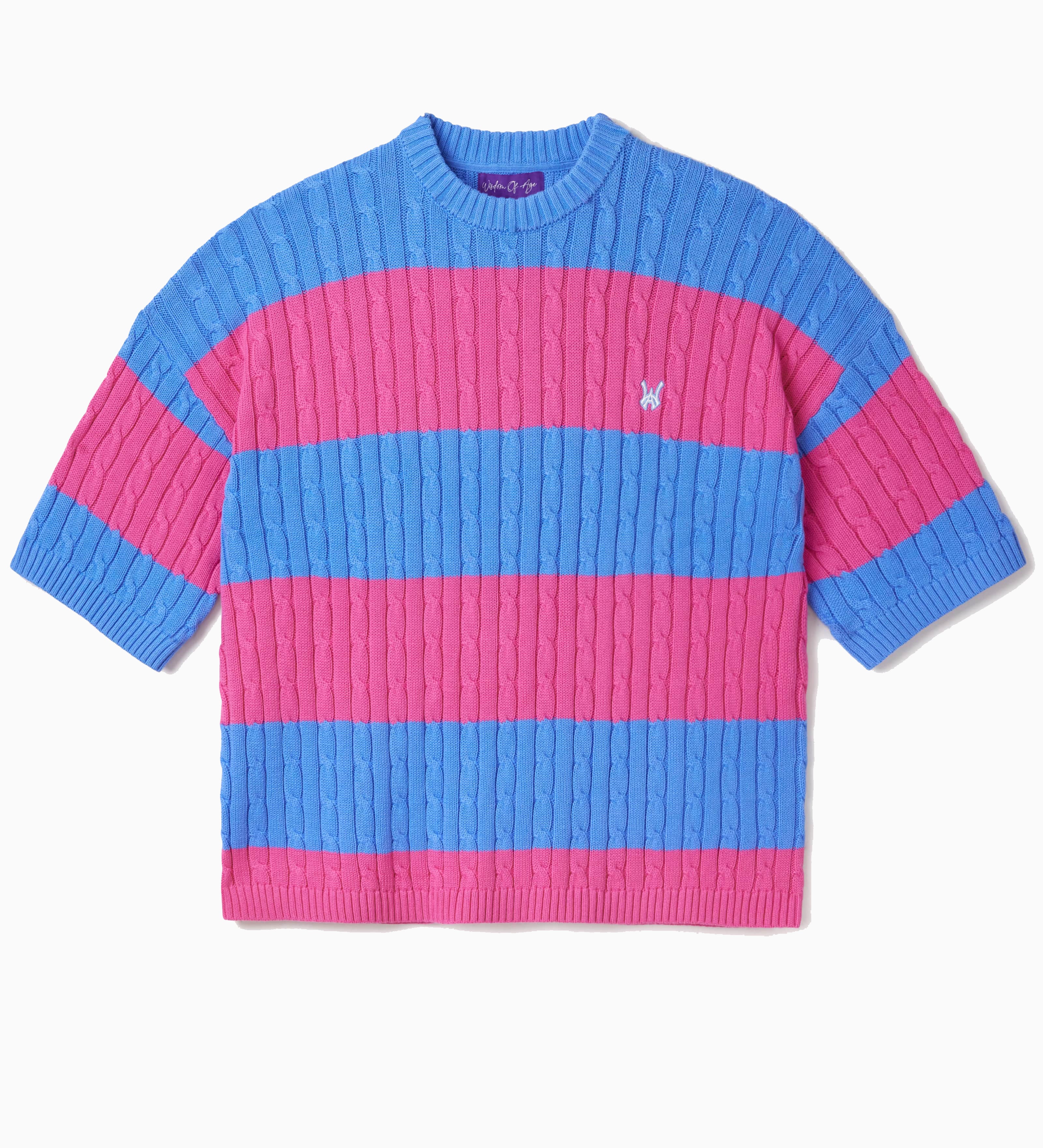 Knitted Baseball Jersey in Cream with 'Wisdom of Age' written in text and various logos on a white background